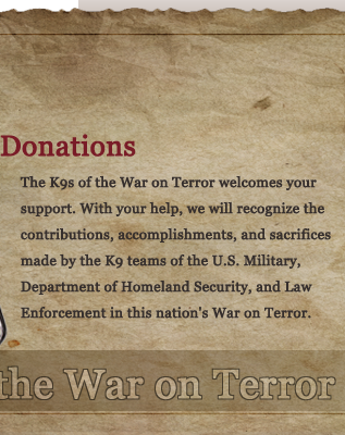 DonationsDonations can be made via direct mail or PayPal. If mailing your donation, please click here to print the Donation Form. Be sure to include your mailing address as it is important to us that all contributors be recognized by the K9s of the War on Terror. Donate Online with PayPal Thank you for supporting the efforts of the Would you like to know more?Is K9s of the War on Terror [K9WT] a reputable charity? The K9s of the War on Terror is a Massachusetts corporation an dis a 501(c)(3) Public Charity as defined under Section 170 of the IRS Code.. Click here for our IRS determination letter. Our Federal ID number is 27-3461813. Contributions to the K9WT are deductable under Section 170 of the IRS Code. The K9WT is also qualified to receive tax deductable bequests, devices, transfers or gifts under Section 2055, 2106 or 2522 of the IRS Code. What is K9s of the War on Terror’s Mission? The mission of the K9WT is, “To recognize the contributions, accomplishments and sacrifices made by the K9 teams of the U.S. Military, Department of Homeland Security and law enforcement in this nation’s War on Terror”. Since September 11, 2001all sectors of this country have been engaged in the War on Terror with little or no recognition for the K9s teams who carry out the day to day tasks in keeping the country safe. The K9WT intends to rectify this by erecting both a monument to these teams as well as presenting the K9 Medal for Exceptional Service to deserving K9 teams. This medal represents the first of its kind to be awarded to animals in the War on Terror. At present the United States is the only major country that does not recognize its war animals with a medal. The availability of this medal is both timely and long overdue for not only military working dog teams, but those of the Department of Homeland Security and the numerous enforcement agencies involved. How does K9s of the War on Terror accomplish its goals? The funding necessary to support the erection of a monument and to maintain the Medals Program will be obtained from both corporate as well as private sources through tax deductable donations. In addition the K9WT maintains an active web store that provides a variety of merchandise specific to the K9WT. How is the K9WT managed? The K9WT is managed by a six man Board of Directors who voluntarily provide their time and expertise in support of the project. None of the board members receives a salary or stipend of any kind and none of the board members profits in any way from the activities of the corporation. A Medals Review Committee composed of three individuals with experience in law enforcement, military history and a retired member of the U.S. military along with the President of the corporation receive, vet and review all applications submitted for the awarding of the medal. How can I donate? Donations can be made online via paypal or via direct mail. Please print out and complete the donation form and mail it in along with your donation to K9s of the War on Terror, Inc., P.O. Box 3436, Waquoit, MA 02536-3436. How is my donation used? Donations to the K9WT are used exclusively to support the construction and erection of the monument and for the ongoing support of the Medals Project. A small percentage of all donations is utilized to support the operation of the corporation. |