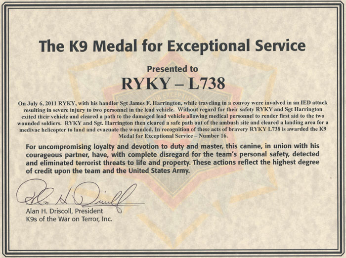 The K9 Medal for Exceptional ServicePresented to RYKY-L738