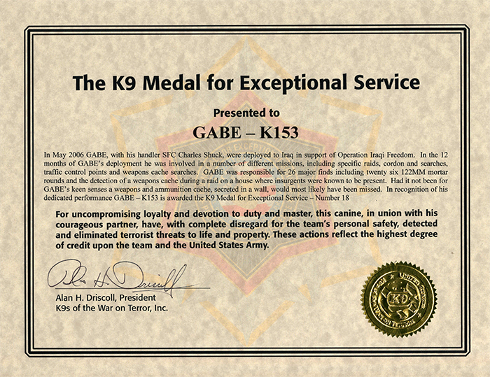 The K9 Medal for Exceptional ServicePresented to Gabe K153
