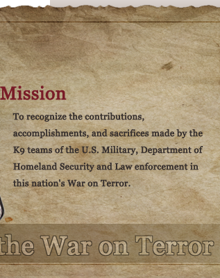 MissionThe K9s of the War on Terror (K9WT) views the relationship between the military, government, and law enforcement in this conflict as both unique and worthy of distinction. The K9WT is currently evaluating two potential locations for the placement of the monument to the K9 teams of the War on Terror. Individual K9 teams are also recognized by the presentation of the K9 Medal for Exceptional Service which is awarded by the K9WT. The Board of Directors of the K9s of the War on Terror is composed of former military dog handlers who have seen service in both Korea and Vietnam. The boards primary concern is to provide the recognition that these K9 Teams so richly deserve. Board of DirectorsAlan H. Driscoll, President/Treasurer The Medals Review Committee is chaired by the President of the K9WT who receives applications for all medals and vets the application before passing it to the Medals Review Committee. The Committee is composed of three individuals with credible experience in the U.S. Military, Law Enforcement and K9 unit training and a military historian and author. It is the Committee who refers medal awards back to the Chairman for action. Medals Review CommitteeAlan H. Driscoll, Chairman |